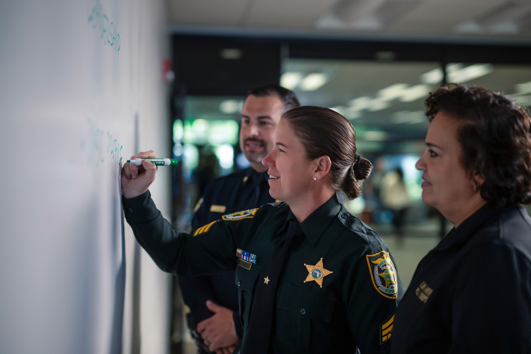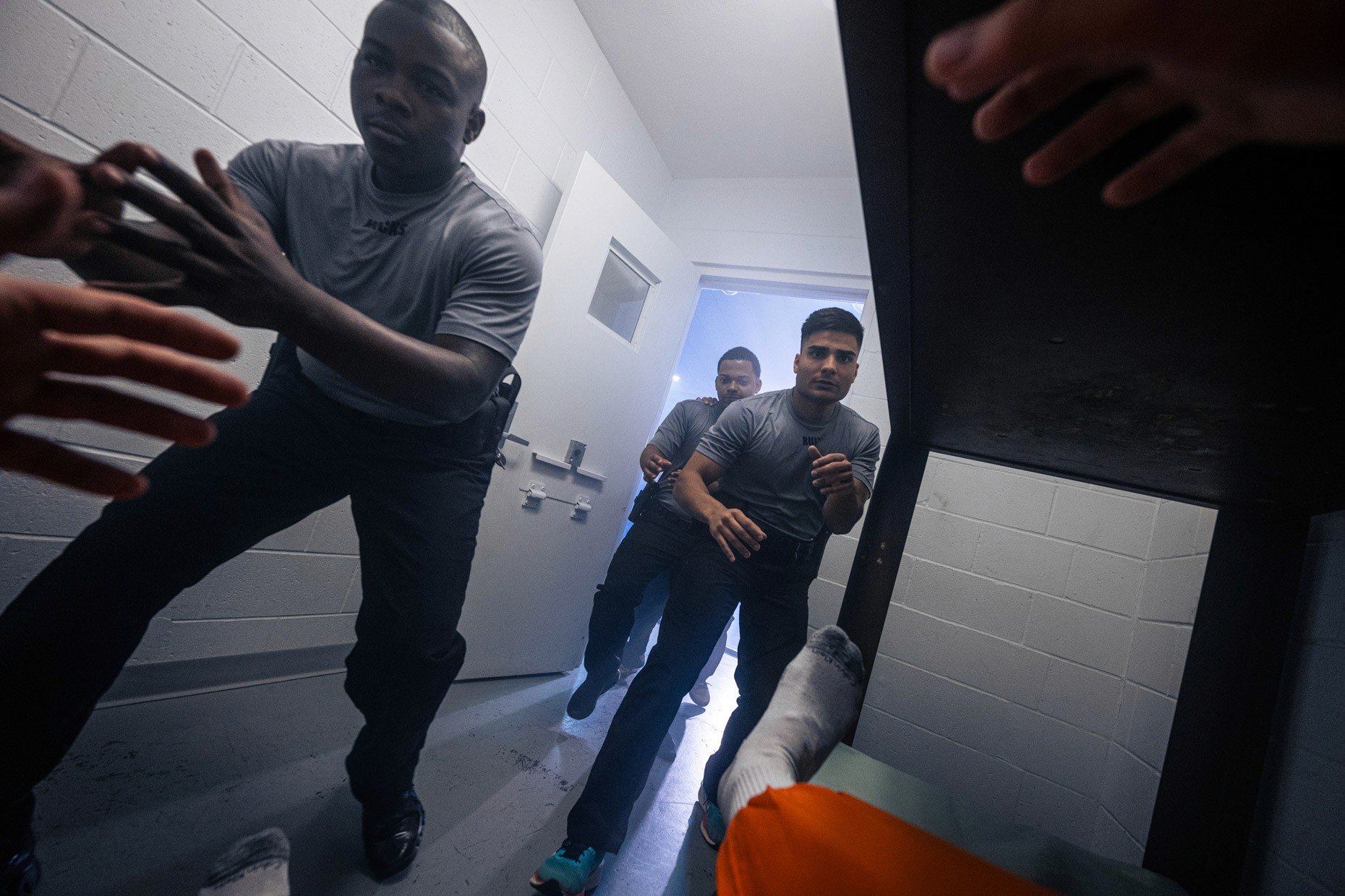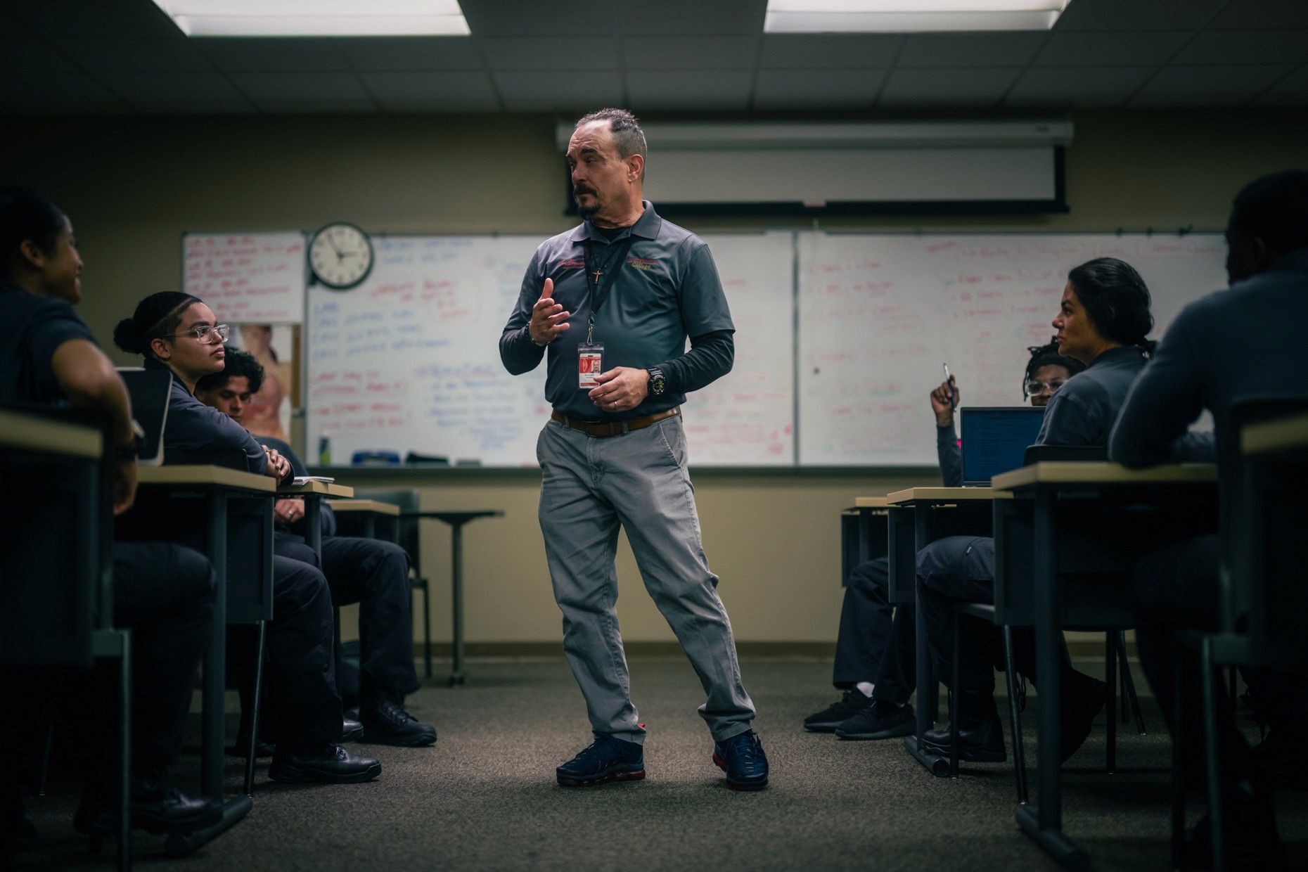 Wardrobe alone was a project. Some programs needed scrubs. Some needed business casual. Law enforcement needed full uniform with recruits lined up next to patrol cars. Fire science needed turnout gear in the gym and classroom attire the same week. Every wardrobe plan was built into the pre-production book before Day 1.